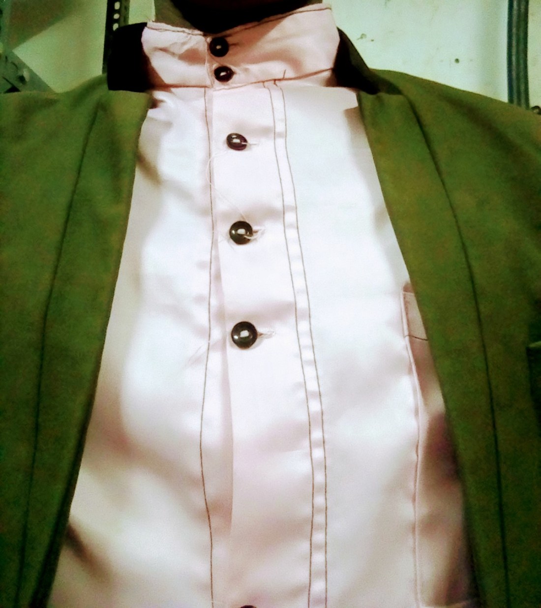 Pink button up shirt and green coat fits your gloom.
