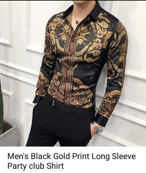 Gold print shirts with a black tuxedo trouser